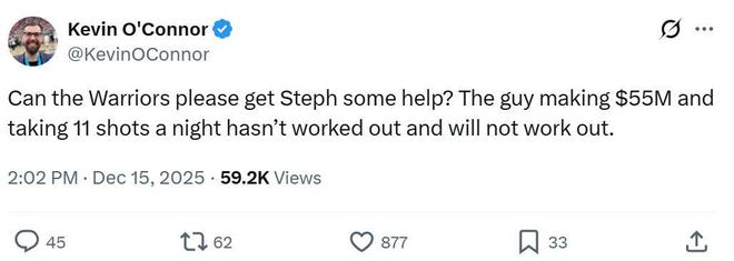 美記Kevin O'Connor直言勇士隊需要為庫里尋找幫手,讓那些拿著5500萬薪水的球員場均出手11次顯然行不通,未來也難有轉機。
