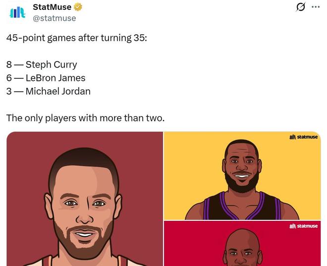 第二項:本場是庫里30歲后第45次單場轟下40+得分,正式超越喬丹升至NBA歷史第一。