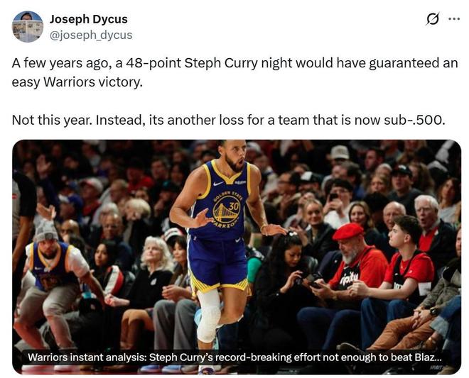 結果在庫里交出如此表現的情況下,勇士隊遭遇2連敗,面對這樣的局面,勇士隊記Joseph Dycus直言不諱表示:“幾年前,當庫里單場砍下48分時,勇士將拿下一場大勝,現在不行了,球隊又輸了。”