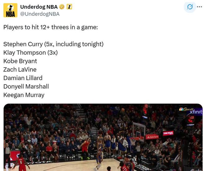 第三項:本場是庫里生涯第5次單場命中12記三分,高居NBA歷史第一,克萊以3次排名第二,NBA其余球員加起來一共5次做到;