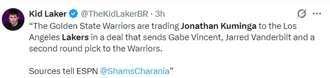 BR記者杰克-費舍爾透露,湖人隊在2025年的交易截止日前就已經開始關注庫明加,因為他們需要側翼球員的支持。湖人隊急需運動能力出眾的側翼已經是眾所周知的消息,湖人非常看重庫明加這位身體素質出色的3-4號位。去年夏天湖人在庫明加跟勇士鬧矛盾時就已經詢價過,湖人對庫明加的興趣已經持續了一年。