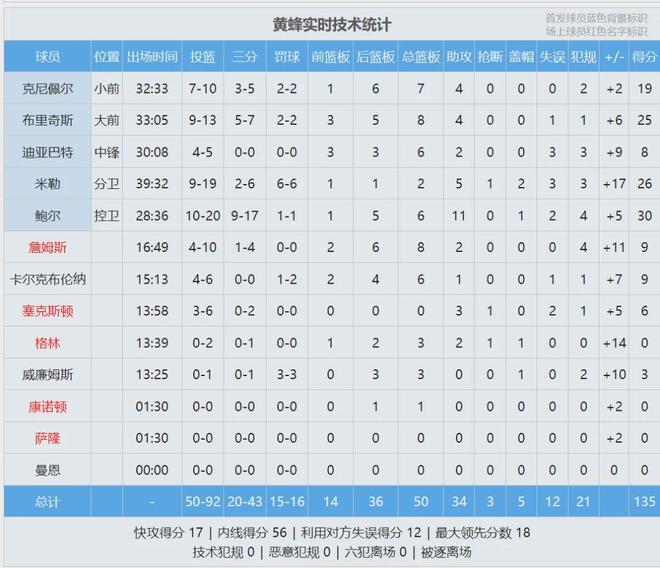 末節決戰,詹姆斯本場得分來到20+,已經連續7場比賽得到20分以上。湖人的問題依然是防不住,黃蜂失誤控制得很好,而且第四節前11次出手進了9個!最后2分半鐘,詹姆斯率領湖人追到10分,三球在外線連續開炮,直接殺死比賽。