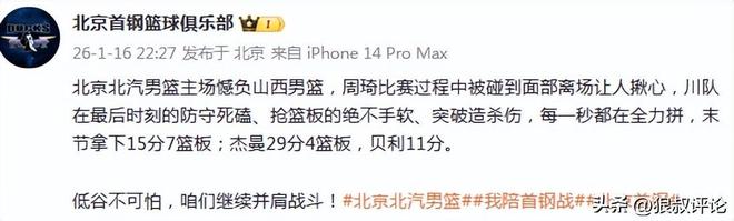 北京官方社媒發文:北京北汽男籃主場憾負山西男籃,周琦比賽過程中被碰到面部離場讓人揪心,川隊在最后時刻的防守死磕、搶籃板的絕不手軟、突破造殺傷,每一秒都在全力拼,末節拿下15分7籃板;杰曼29分4籃板,貝利11分。