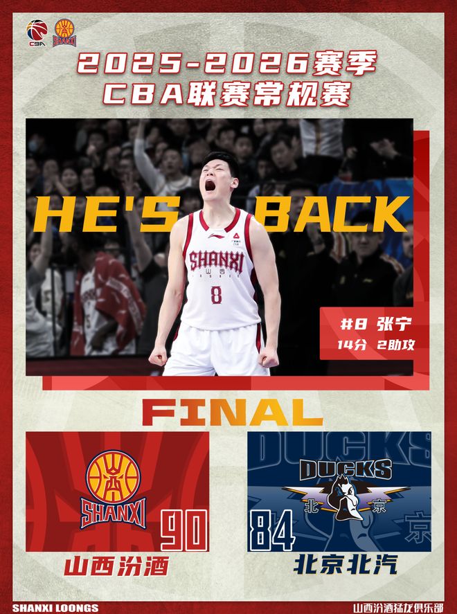 北京時間2026年1月16日19:35,2025-2026賽季CBA聯賽常規賽第15輪繼續進行,山西汾酒客場挑戰北京北汽。兩隊歷史上共交手52次,山西汾酒18勝34負;上賽季兩隊交手5次,山西汾酒2勝3負。本場比賽,山西隊背負巨大壓力,開局依舊慢熱,進攻端畏首畏尾,一度陷入停滯。經教練組調整后,全隊團結一致、力拼防守,始終緊咬比分,末節關鍵時刻展現出足夠韌勁,最終成功取勝。全場比賽結束,山西汾酒90:84戰勝北京北汽。
