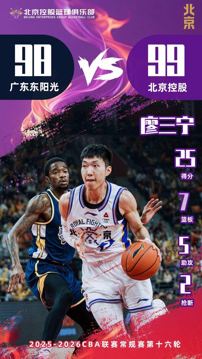 1月17日,北控男籃南下廣東首個客場對陣廣東東陽光。本場比賽,雙方經歷了全程勢均力敵的纏斗,憑借廖三寧最后階段精準中投以及壓哨神仙球,北控男籃以99:98絕殺廣東東陽光。