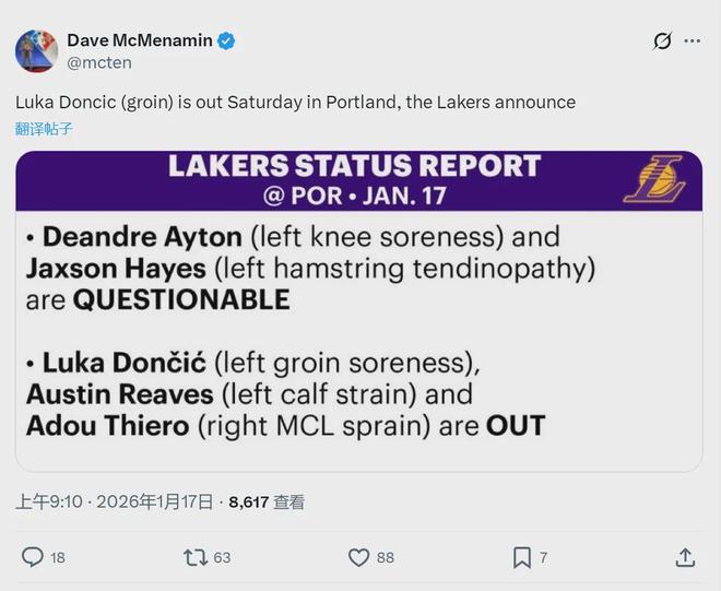 北京時間1月17日上午9點,湖人官方公布球隊傷病報告:東契奇(腹股溝酸痛)、里夫斯(左小腿拉傷)、蒂耶羅(右膝韌帶扭傷),將缺席明天和開拓者的比賽。此外,艾頓(左膝酸痛)和海斯(左腿筋肌腱炎)均是出戰成疑。