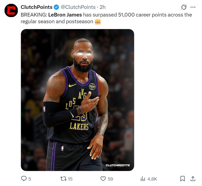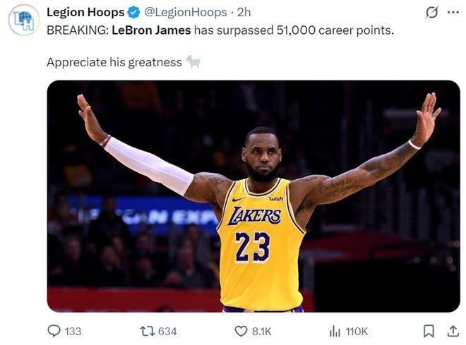 美媒LH寫道:重大消息,勒布朗-詹姆斯達(dá)成51000分里程碑,欽佩他的偉大之處GOAT。