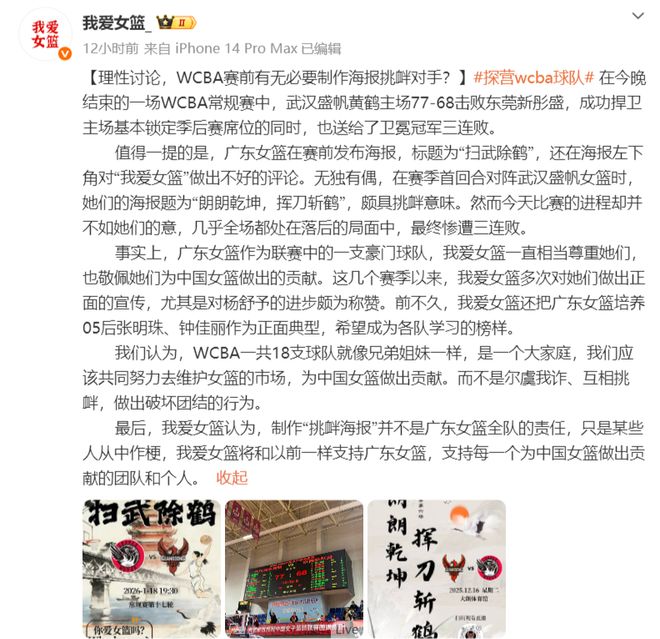 一場普通的WCBA常規(guī)賽卻因?yàn)橘惽昂?bào)遭到了爭議:廣東女籃在與武漢女籃的賽前海報(bào)內(nèi)容為“掃武除鶴”,沒想到卻被對(duì)方擊敗,遭遇三連敗。賽后,自媒體“我愛女籃”也對(duì)廣東女籃的海報(bào)內(nèi)容進(jìn)行了反擊。