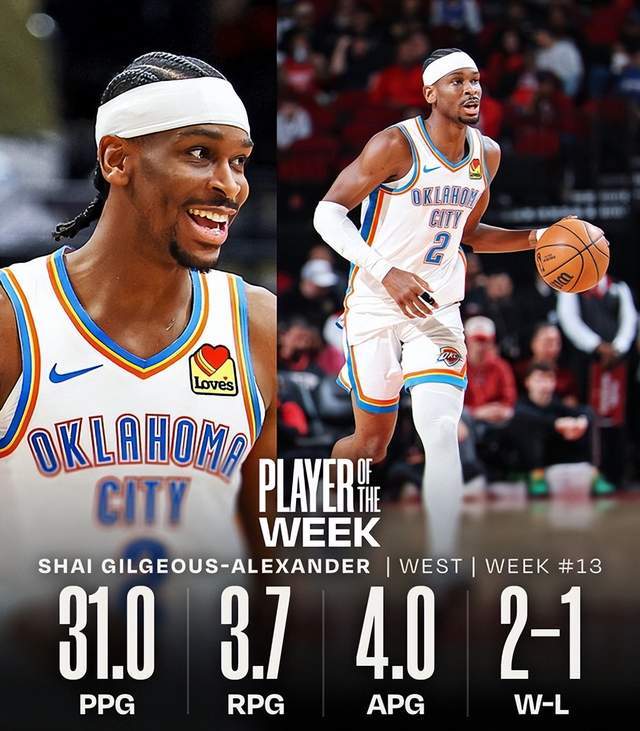 過去一周,亞歷山大率領雷霆打出2勝1負的戰績,場均31分3.7籃板4助攻2蓋帽,投籃命中率54.7%。