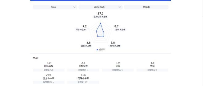 本賽季13次出場后,胡明軒的場均三分命中率只有23.8%,投籃命中率為32.2%。