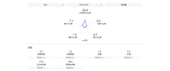 14次出場后,原帥場均三分命中率只有37.3%,場均只能為球隊貢獻7.1分。