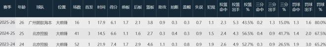 本賽季至今,陳國豪出戰16場比賽,場均上陣17.9分鐘,拿下6.1分3.8板,投籃命中率43.5%,場均得分以及命中率均是生涯新低,離開北控隊之后并沒有打得更好。