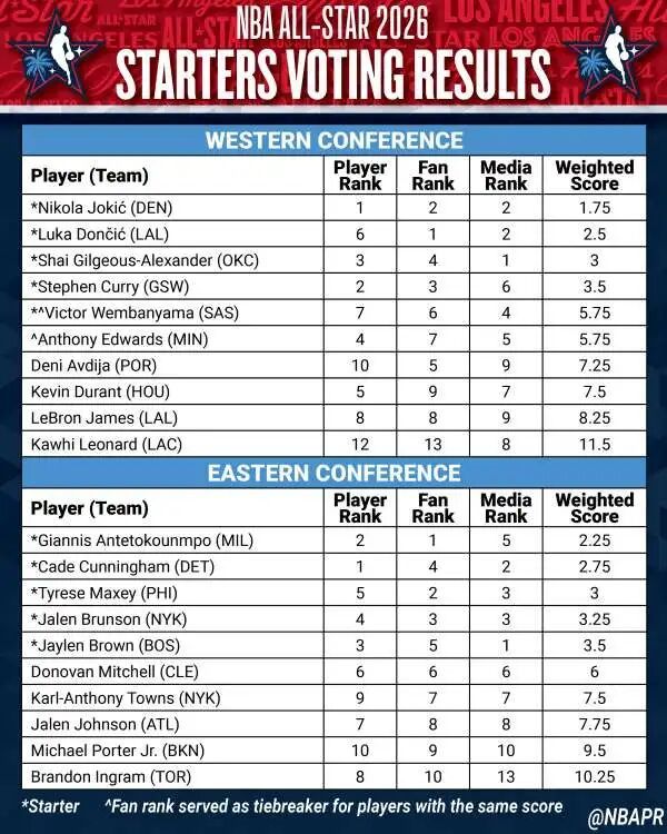 文班亞馬和華子加權(quán)得分相同,但文班亞馬憑借球迷投票優(yōu)勢(shì)成為首發(fā)