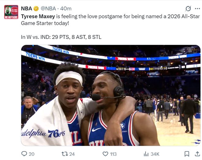 北京時間1月20日,費城76人113-104大勝印第安納步行者。這場比賽是一場拉鋸戰,費城是在下半場才開始掌控大局,馬克西、恩比德兩位核心發揮出色,頂替喬治先發的烏布雷也拿到18分5助攻的數據助力雙帝。