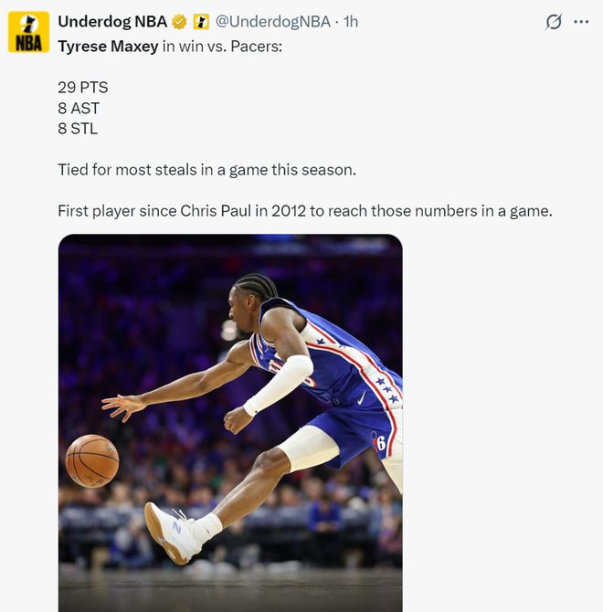 4.馬克西單場29+8+8搶斷是費城隊史自艾弗森后第二人。