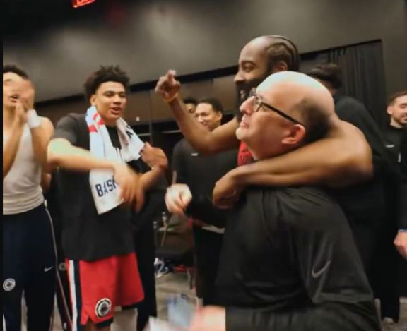 對(duì)了,賽后哈登在更衣到帶頭為助教范甘迪唱起了生日歌