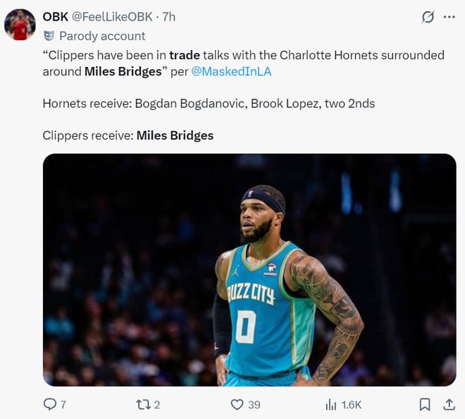 1月21日,埃文-斯迪瑞又報道,湖人與黃蜂已經就邁爾斯-布里奇斯進行過試探性的對話。實際上在小橋1月16日拿到25分8籃板4助攻幫助黃蜂擊敗湖人后,他的競技狀態就暴跌。