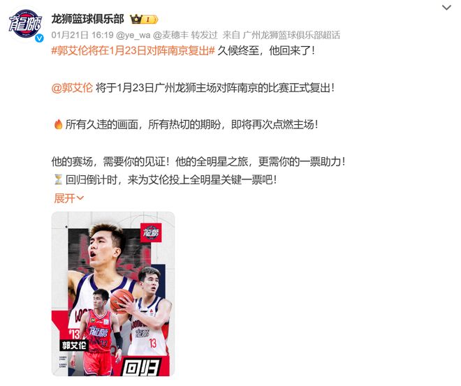 目前廣東的氣溫很低,愿意去看球的球迷正在變少,但廣州龍獅男籃此時官宣郭艾倫復出,還是對于球隊有著非常明顯的幫助,也是為郭艾倫的全明星投票進行了很好的拉票。