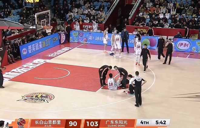 不過,廣東隊雖然收獲了一場大比分勝利,但是,有一件事,卻讓球迷有一點揪心,沒錯,那就是在第四節比賽的時候,廣東隊中鋒焦泊喬,出現了意外受傷的情況。在比賽還有5分42秒的時候,焦泊喬在防守移動過程中,被對方絆倒,隨后,我們就可以看到焦泊喬捂住自己的腳踝,表情十分痛苦。