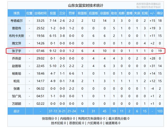 全場比賽,2米26的張子宇,一共打了7分46秒,第一節比賽,打了4分06秒,投籃5中5,砍下了10分4籃板。第二節比賽、第三節比賽,張子宇都是沒有打。到了末節比賽,張子宇再一次登場,打了3分鐘40秒,投籃7中4,交出了9分6籃板,就這樣,張子宇輕松交出了19分10籃板1蓋帽的兩雙數據。(10個籃板球當中,其中,有6個是進攻籃板球。)