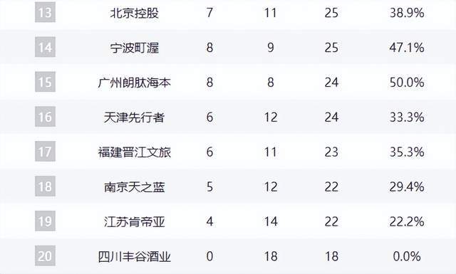 積分榜第13名是北控隊,戰績與新疆隊相同,為7勝11負。第14名屬于寧波隊,戰績為8勝9負。廣州隊以8勝8負的戰績排在第15名,在少賽兩輪的情況下,排名較為吃虧。積分榜第16名至第20名則分別是天津隊、福建隊、同曦隊、江蘇隊和四川隊。江蘇隊本輪掀翻天津隊,成功拿到賽季第4勝,而四川隊則繼續在積分榜墊底。