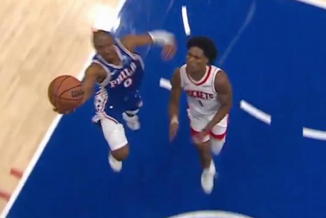 比賽末節(jié)最后時刻,雙方115-115戰(zhàn)平,76人后衛(wèi)馬克西持球突破沖進內線完成上籃,在籃球觸碰到籃板后,火箭前鋒杜蘭特再次觸碰籃球,按照規(guī)則應該是干擾球違例,但裁判并未吹罰。