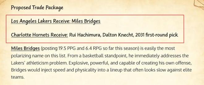 美媒《Fadeaway World》撰文建議,湖人應該考慮將八村壘、克內克特以及2031年的首輪簽送到黃蜂,換回前鋒布里奇斯。