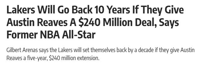 “也就是說,要是哪支球隊真的鐵了心想得到他,就必須付出遠超籌碼價值的代價,這正是我們(湖人)所期待的。因為一旦你(湖人)真的給他開出2.4億美元的合同,球隊很可能會因此倒退整整十年?!?/p>