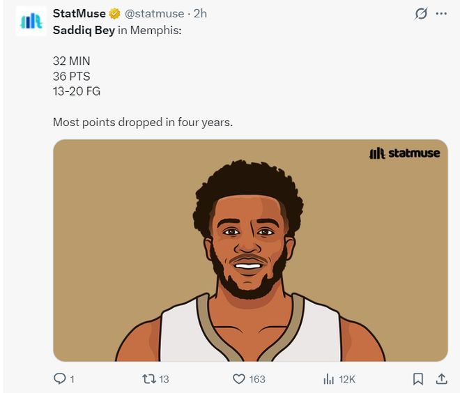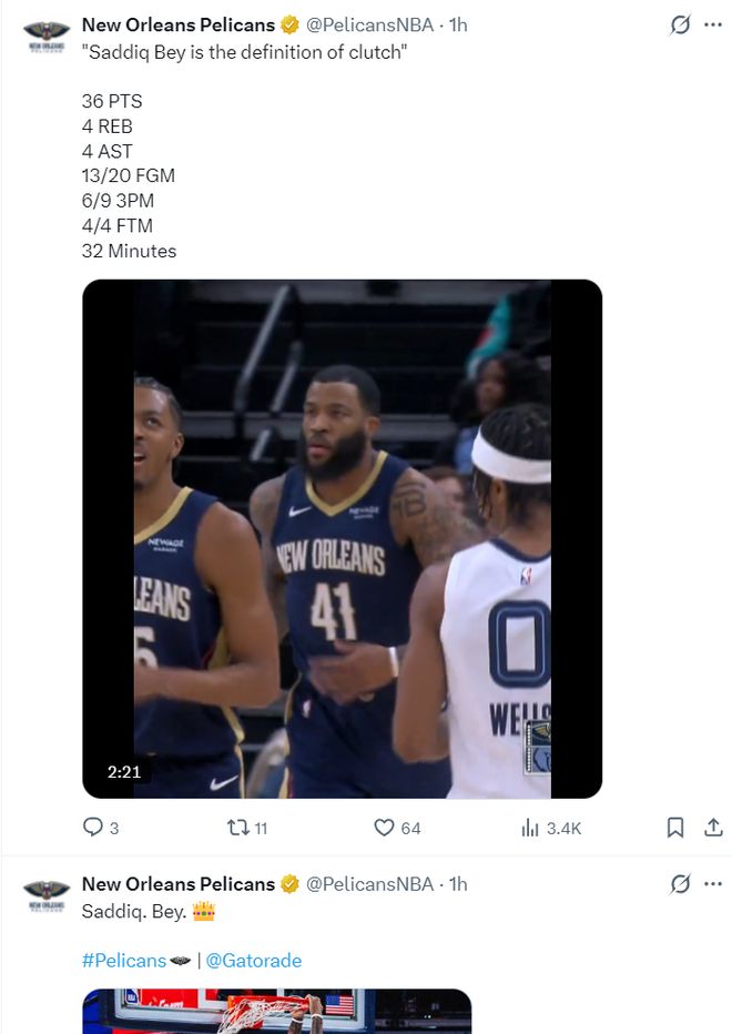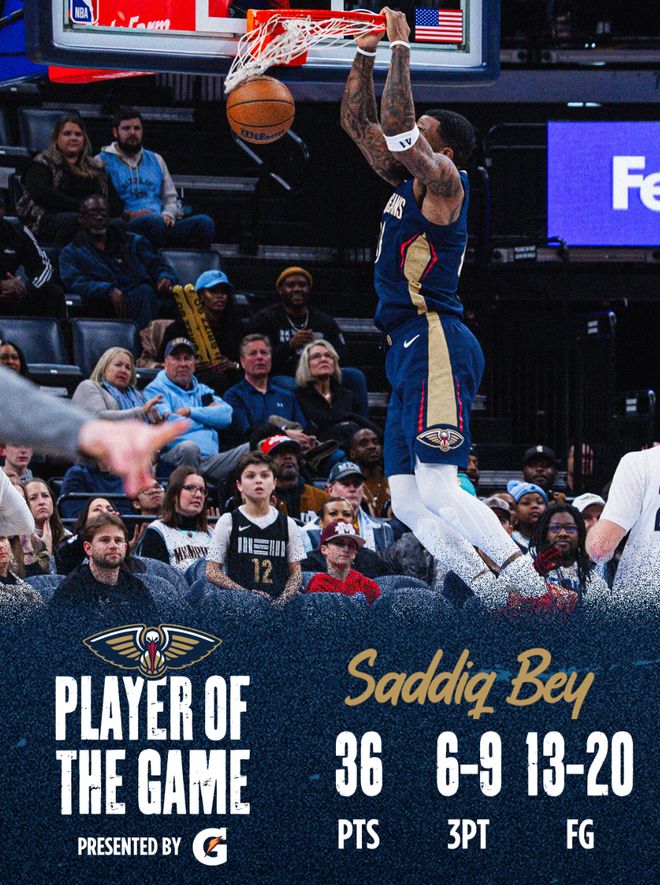 這場比賽薩迪克-貝打出了鵜鶘生涯最高光的一場比賽,32分鐘,20中13,三分9中6,罰球4中4,拿到36分4籃板4助攻1搶斷0失誤,命中率65%,三分命中率66.7%,真實命中率82.7%,正負值+5。