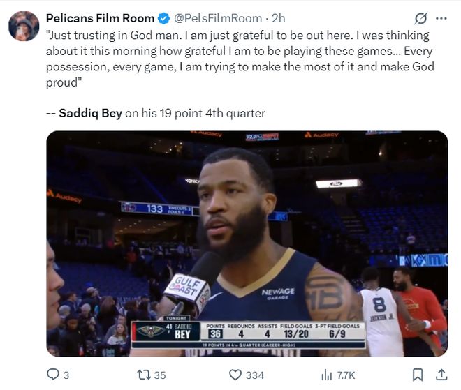 薩迪克-貝32分鐘,拿到36分4籃板4助攻1搶斷(末節19分);鵜鶘隊末節打出40-26的浪潮多虧了薩迪克-貝。