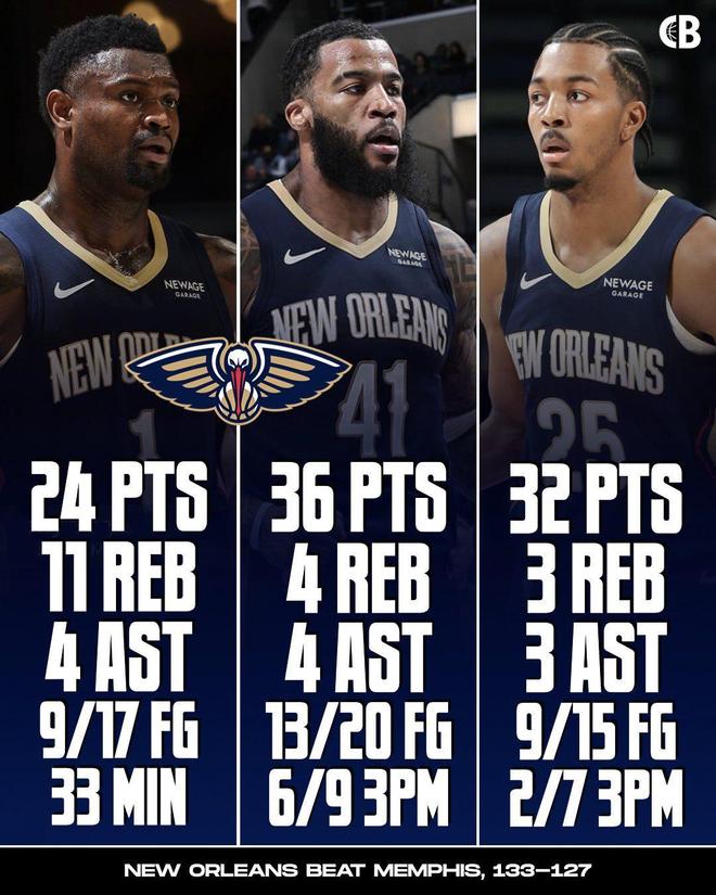 此役鵜鶘擊敗灰熊的三個功臣,分別是:錫安-威廉森、特雷-墨菲、薩迪克-貝,胖虎全場比賽33分鐘,拿到24分11籃板4助攻(末節7分3籃板1助攻2搶斷);