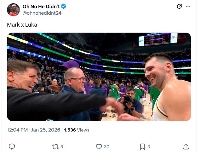 值得一提的是,賽后東契奇不忘與獨行俠前老板庫班寒暄,兩人開懷大笑。