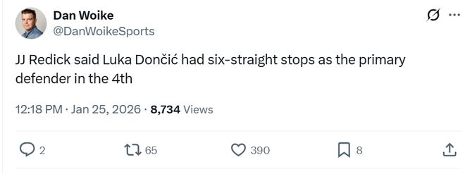 賽后東契奇承認自己當時的確有點恍惚:“我覺得今天的確有點恍惚,我想起了第一次來到這的時候,結果忘了客場更衣室在更遠的地方,中場時我走錯了通道,當時我有點懵了。”