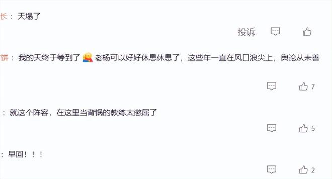 支持楊鳴下課的球迷則是列舉出了楊鳴應該下課的多條理由,比如楊鳴上任這些年一直在吃老本,沒有鍛煉出任何新人;后衛線練來練去,最終只練出了一個鄢手騏,李虎翼、張峻豪都被耽誤了;張陳治鋒作為隊內唯一一個足尺寸的中鋒,在楊鳴手底下卻經常得不到重用;姜宇星、王嵐嵚付豪這幾個邊緣國手,在各隊表現都還不錯,湊在一起卻沒有打出化學反應等等。