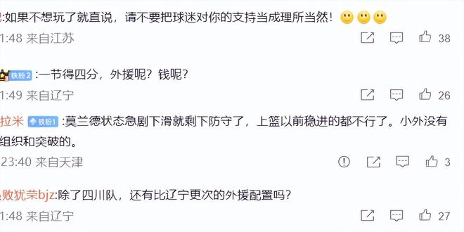 在輸給了新疆后,不少遼寧球迷賽后跑到遼寧官方賬號下留言表達不滿,矛頭直接指向管理層:如果不想玩了就直說,請不要把球迷對你的支持當成理所當然!除了四川隊,還有比遼寧更次的外援配置嗎?俱樂部不出來說點啥嗎?別老讓教練和球員背鍋了!