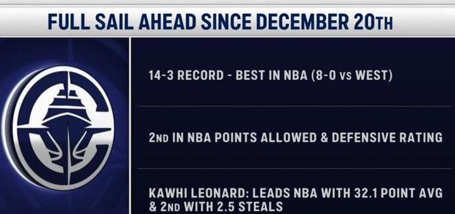 盡管一度看起來遙不可及,但在之后的17場比賽中,快船隊取得了14勝3負的戰績,NBA同期戰績最佳。此外,他們還打出了同期第二少的失分以及防守效率。快船球星倫納德在此期間場均32.1分,并且貢獻了同期第二多的場均2.5次搶斷。