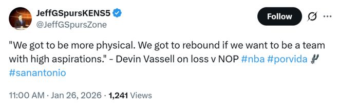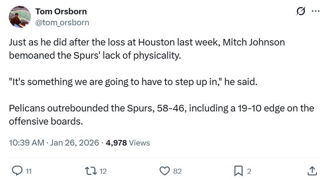或許是因?yàn)閷?duì)手鵜鶘隊(duì)實(shí)力相對(duì)有限,本賽季馬刺隊(duì)又展現(xiàn)出不俗競(jìng)爭(zhēng)力,本場(chǎng)馬刺隊(duì)的努力程度不足,尤其是在防守端。
