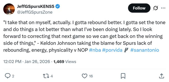 凱爾登約翰遜給出相同說(shuō)法,主動(dòng)攬責(zé)道:“實(shí)話實(shí)說(shuō),我把這歸咎于自己,必須在籃板上做得更好,我要主動(dòng)為球隊(duì)定下基調(diào),在各個(gè)方面都要做得更好,我已經(jīng)開(kāi)始期待下一場(chǎng)比賽中糾正這些問(wèn)題,這讓我們才能重新回到勝利的軌道上。”