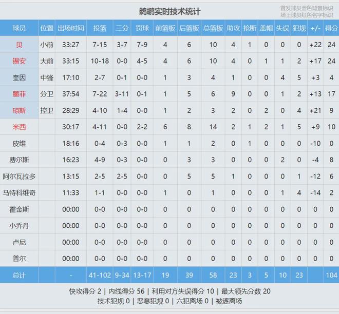 四節比分(鵜鶘在前):25-28、31-19、26-21、22-27。第四節馬刺轟出一波24-5,一度完成反超。但鵜鶘還了一波13-0,直接帶走比賽勝利。福克斯8中4得到12分7助4失誤,罰球4中1;卡斯爾投籃6中1僅得5分4板5助2失誤。