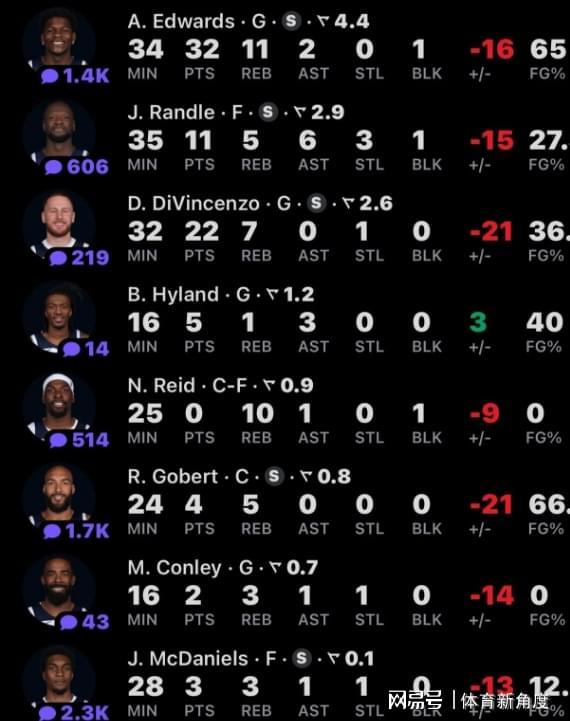 再說說今天全場最閃亮的“奇葩之星”——華子。20投13中,罰球3中2,砍下32分11板2助,可這失誤數也高達8次,一個后衛交出這樣的數據,讓人又愛又恨。不過話說回來,輸球這事兒也不能全怪華子,他那群隊友們也得好好反思反思。森林狼這問題到底出在哪兒呢?上賽季還被吹噓這套陣容潛力無限,畢竟連續兩年都殺進了西決,可現在呢,眼看著又要走上重建的“老路”了。