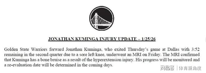 之前啊,巴特勒受傷,庫明加這小子鬧完別扭終于肯上場打球了,本以為能好好表現一番,結果才打了2場就又受傷了。今天勇士官方正式宣布,庫明加這左膝過度伸展,都搞出骨挫傷了,具體啥時候能再上場,那得等過幾天復查之后才能知道。這交易截止日眼看著就剩沒幾天了,您說這庫明加還能像商品一樣被“打包”交易出去嗎?
