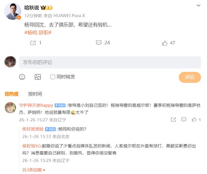據“哈秋”在個人社交媒體上寫道:“楊導回沈,去了俱樂部,希望還有轉機…”看得出,官方還在盡力挽留楊鳴。
