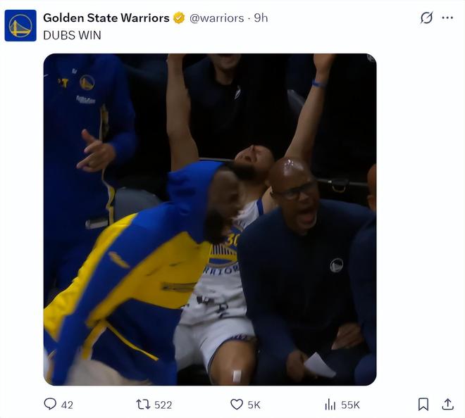 庫里末節(jié)僅登場5分鐘,4中2+三分2中1+罰球4中4拿到9分后就被科爾換下休息,因為兩隊的分差過大,庫里也在場下瘋狂的為隊友吶喊打Call,當隊友命中三分球時他再一次雙手舉天慶祝,本賽季有太多的比賽是依靠科爾的12人輪換拿下,庫里的登場時間并不多。