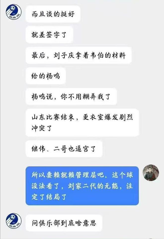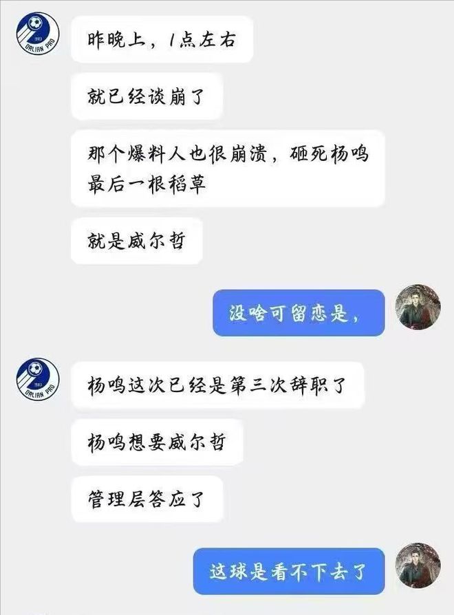 事后球迷評(píng)論區(qū),有球迷曬出了一張和“知情人”聊天的截圖,據(jù)“知情人”透露,這不是楊鳴第一次選擇辭職,而是第三次,“砸死”楊鳴的最后一根稻草,就是威爾哲,之前楊鳴想要管理層引進(jìn)威爾哲,管理層答應(yīng)了,并且雙方就差簽字了,但到了最后,總經(jīng)理劉子慶卻出爾反爾,拿著韋伯的材料給楊鳴,楊鳴表示:你不用糊弄我了。
