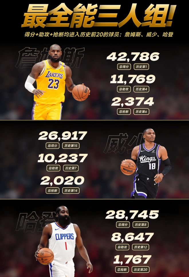 現(xiàn)役也只有三人得分、助攻、搶斷進(jìn)入前20,這三人分別是:詹姆斯、威少、哈登。