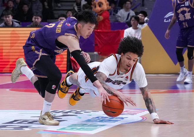 1月26日,北京控股隊球員廖三寧(左)和長白山恩都里隊球員威爾遜在比賽中拼搶。新華社記者 雒圓 攝