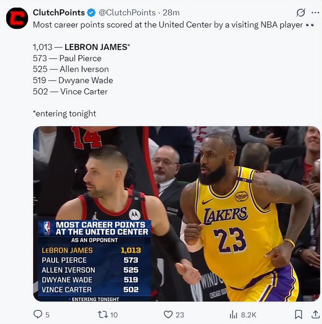 此役勒布朗也繼續(xù)刷新歷史首人紀(jì)錄,在公牛球館已經(jīng)拿到1013分+是歷史第一多。