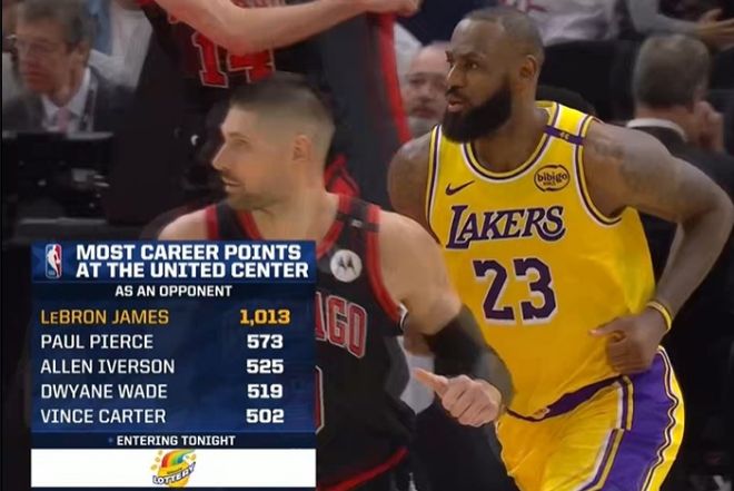 詹姆斯在末節比賽打破得分荒,但進攻威力依然伴隨體能下滑減弱。所幸,湖人還是擋住公牛反撲拿下勝利,詹姆斯也成為NBA歷史首位在芝加哥聯合中心,作為對手轟下超過1000分的球員,而排名第二的皮爾斯是573分,距離詹姆斯的紀錄相差甚遠。