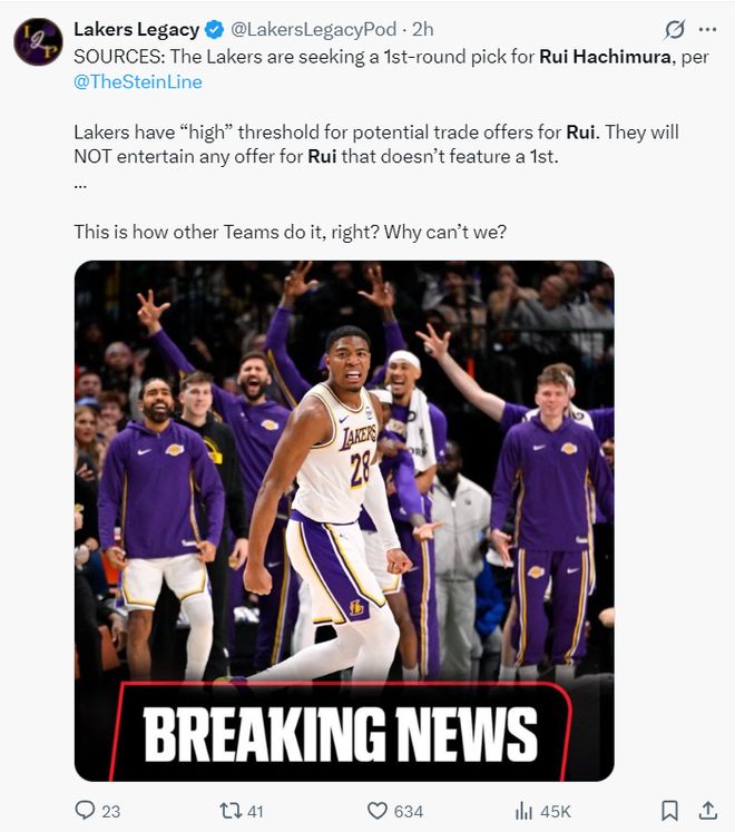 根據NBA記者馬克-斯坦恩的報道,湖人隊正在評估八村的交易價值,他們的要價至少是一個首輪簽。湖人對涉及八村的交易有著很高的要求,他們絕對不會接受沒有首輪簽的任何交易提議。