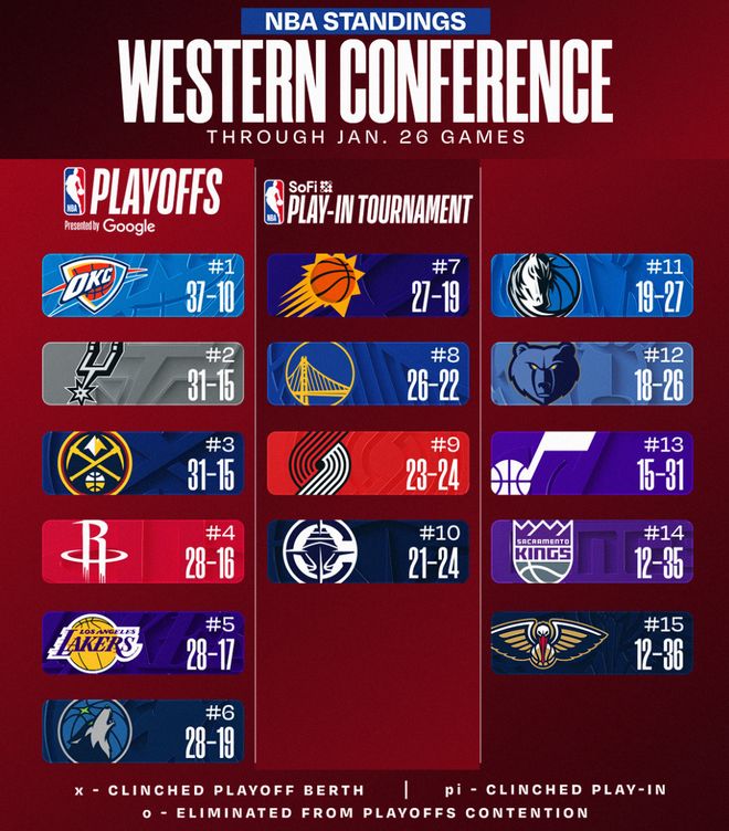 這個比賽日后,西部排名:雷霆、馬刺、掘金、火箭、湖人、森林狼、太陽、勇士、開拓者、快船、獨行俠、灰熊、爵士、國王、鵜鶘。